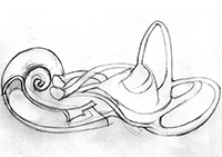 Übergroße Zungen aus nicht minder großen Trichtern bedecken die Rückwand im Raum. Das Motiv erinnert an Löwenmaulblüten. Eine weitere Wand zeigt eine mächtige Gehörschnecke. Sie liegt da wie ein Fötus in der Fruchtblase. Man möchte leise ein Wiegenlied anstimmen.